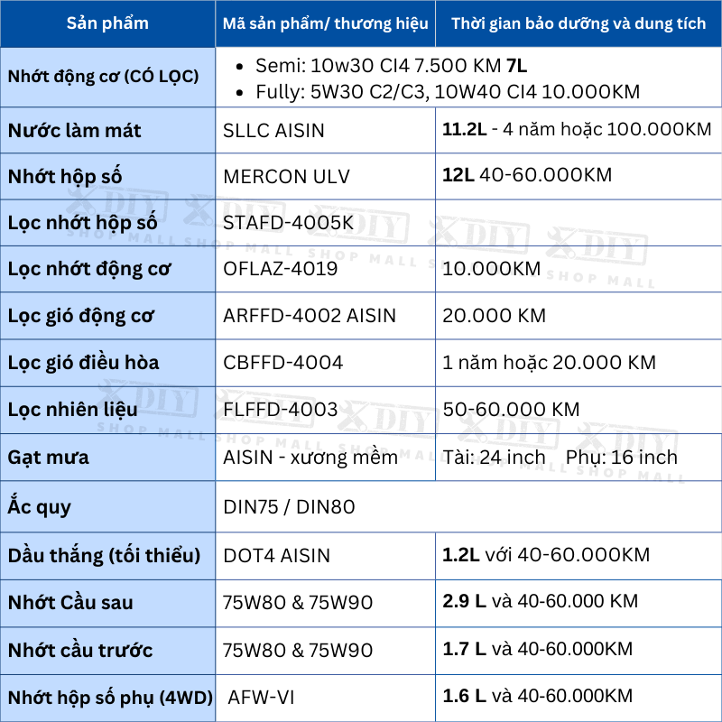 - Fully Synthetic: 5W30 C2/C3 hoặc 10W40 CI4 – thay mỗi 10.000 km