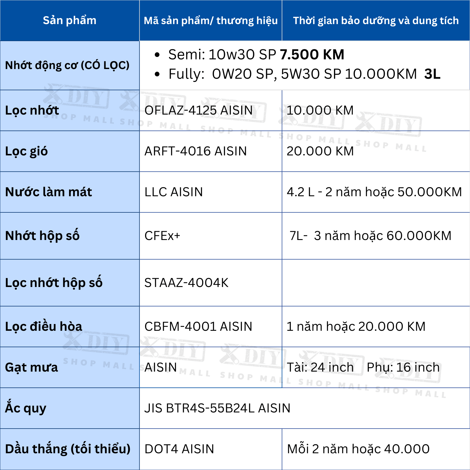 Nhớt động cơ nên thay từ 7.500 đến 10.000 km tuỳ loại dầu sử dụng. Lọc nhớt thay cùng mỗi lần thay dầu. Lọc gió và lọc điều hoà nên kiểm tra định kỳ và thay mới mỗi 20.000 km. Dầu hộp số CVT và lọc hộp số nên thay từ 50.000–60.000 km để đảm bảo độ bền. Nước làm mát và dầu thắng thay định kỳ theo thời gian để đảm bảo an toàn vận hành.