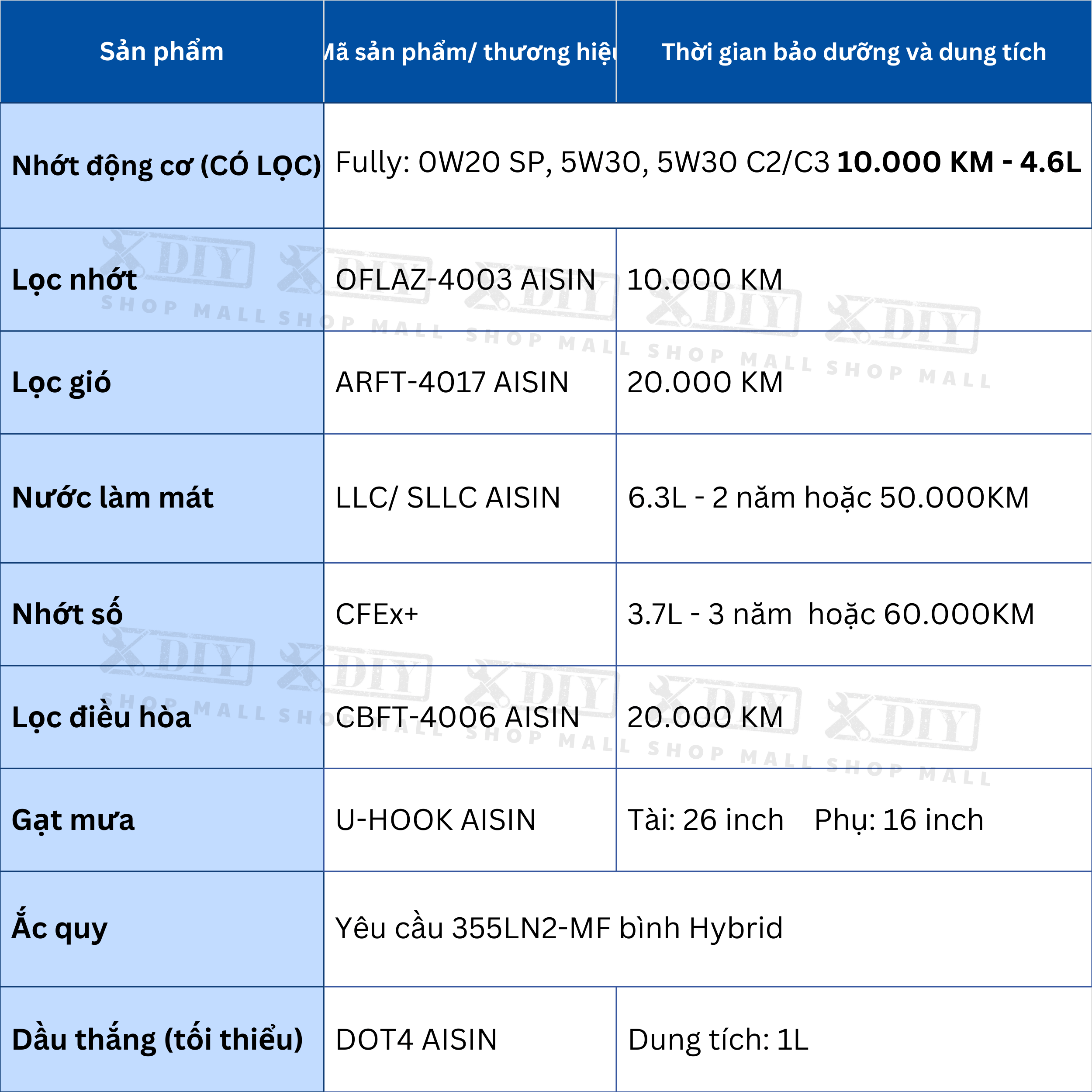chuẩn AISIN gồm dầu nhớt, lọc, nước mát, dầu CVT, phụ tùng chính hãng giúp xe Hybrid vận hành bền bỉ và tiết kiệm nhiên liệu.